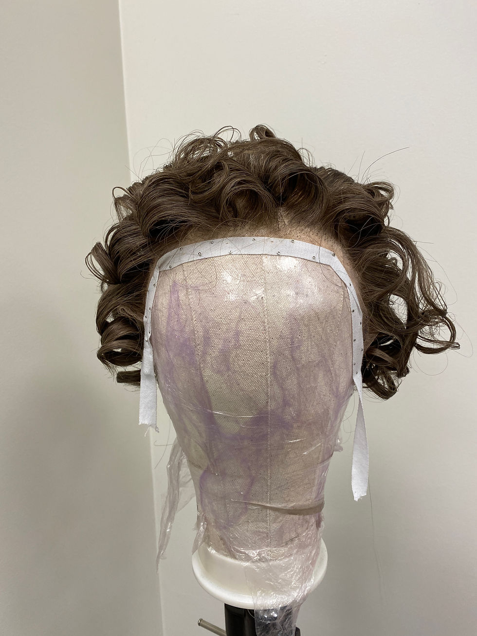 Using a short human hair wig, the front of the hair is set in a deep side parting with small green flocked rollers rolled away from the parting. The green rollers are available from the following link: https://thewigdepartment.com/products/781-24mm-green-flocked-hair-roller-6-5-cm-long?_pos=5&_sid=eed546628&_ss=r. This is done to create large volume and a subtle finger wave at the front.