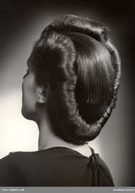 The roller set is placed under a hood drier; the rollers are removed to reveal bouncy curls. The hair is brushed out with a wig brush, the front sections of the hair are backcombed slightly underneath. Using a cylinder object, the hair is wrapped round and smoothed with hairspray then pinned in place.